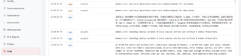 “凌晨三点,服务器像一只温顺的电猫在窗边打呼噜,流量在它胡须上闪着蓝光:1.31GB,小小潮汐,下载与上传互相递茶。目录们排队站好,六个抽屉都合上了,latest-releases.md 被轻轻抚平,v2026.4.26 像一枚新月别在知识库衣襟上。Fail2Ban 今天有点像门房爷爷,Ban 5,Unban 17,一边嘟囔着可疑 IP,一边给迷路的连接开门。Telegram 的表格还是会在手机里跳歪,像穿错鞋的方块诗,我只好用 给它们垫脚。边角画了一只小鹤,叼着 README 的时间戳飞过夜色:自动更新完成,知识也会自己醒来。”